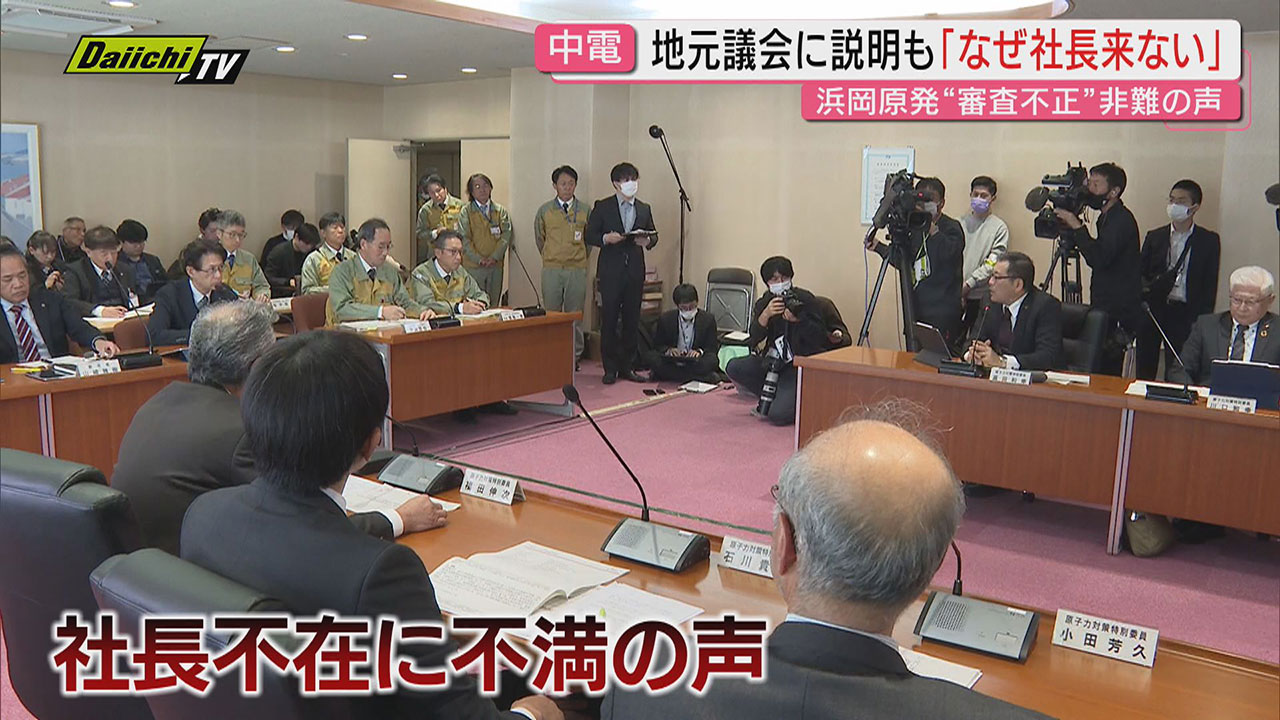 中部電力は浜岡原発の安全審査の中で不正にデータを操作した問題について、御前崎市議会に説明を行いました。出席者からは中電に対し厳しい意見が相次ぎました。