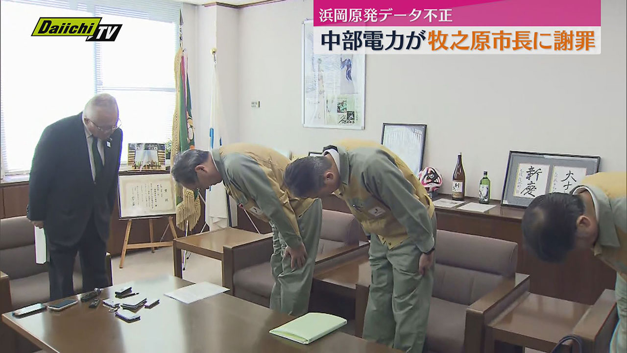 浜岡原発の再稼働に向けた審査をめぐり中部電力が不正にデータを操作した問題で14日、中電の幹部が牧之原市長に謝罪しました。