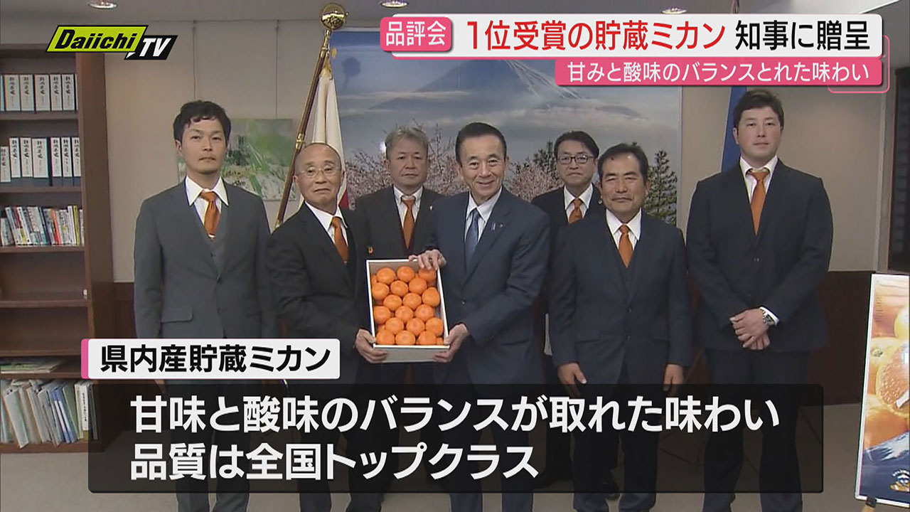 長期間 楽しめることが特徴の「貯蔵ミカン」の品評会で優秀な成績を残したミカンが、28日、静岡・知事に贈られました。