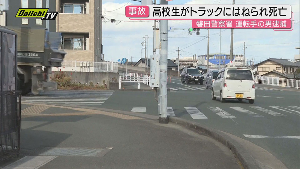 22日朝、静岡・磐田市の交差点で、横断歩道を自転車で渡っていた男子高校生が、トラックにはねられる事故がありました。男子高校生は病院に搬送されましたがその後、死亡が確認されました。警察は、トラックの運転手を逮捕しました。