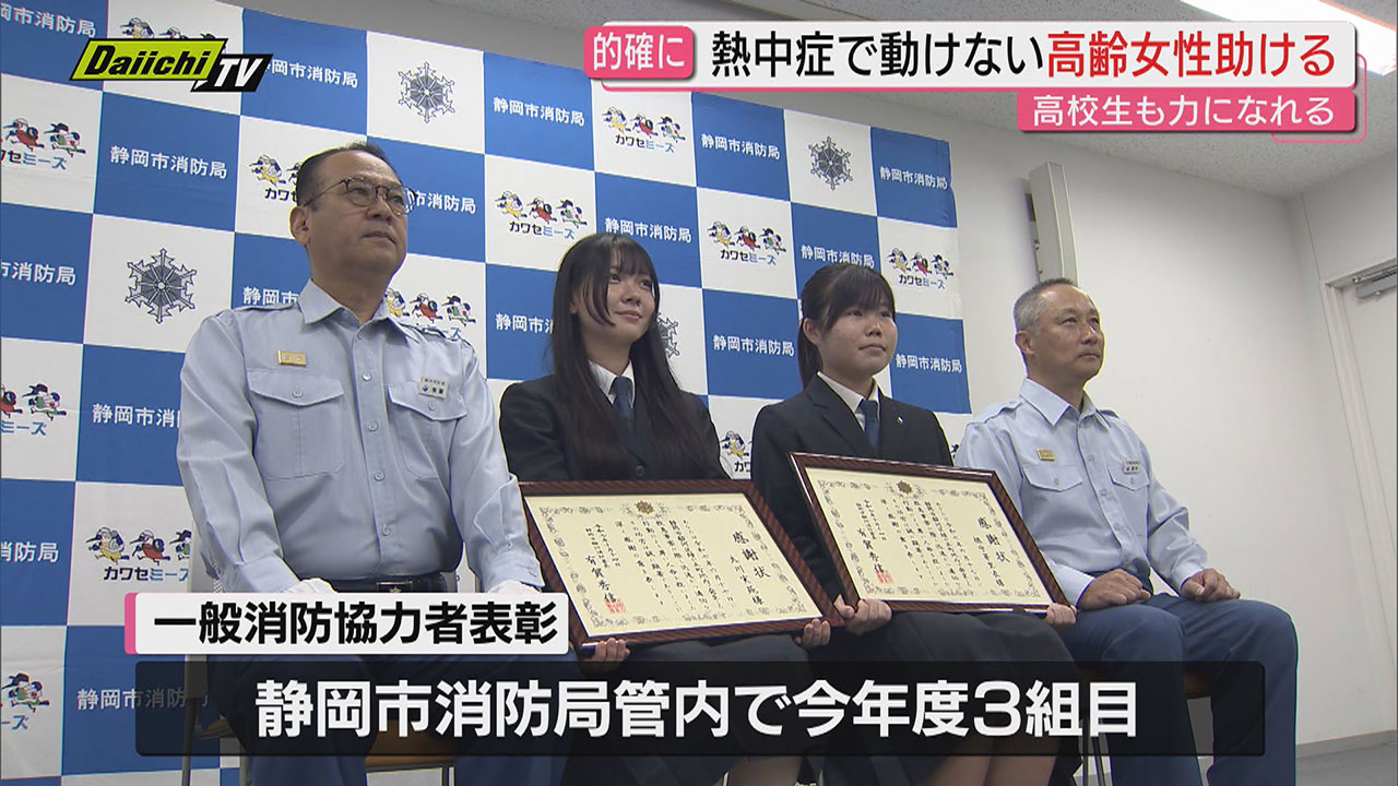 熱中症で動けなくなっていた80代の女性を助けたとして、高校生2人に静岡市の駿河消防署から感謝状が贈られました。
