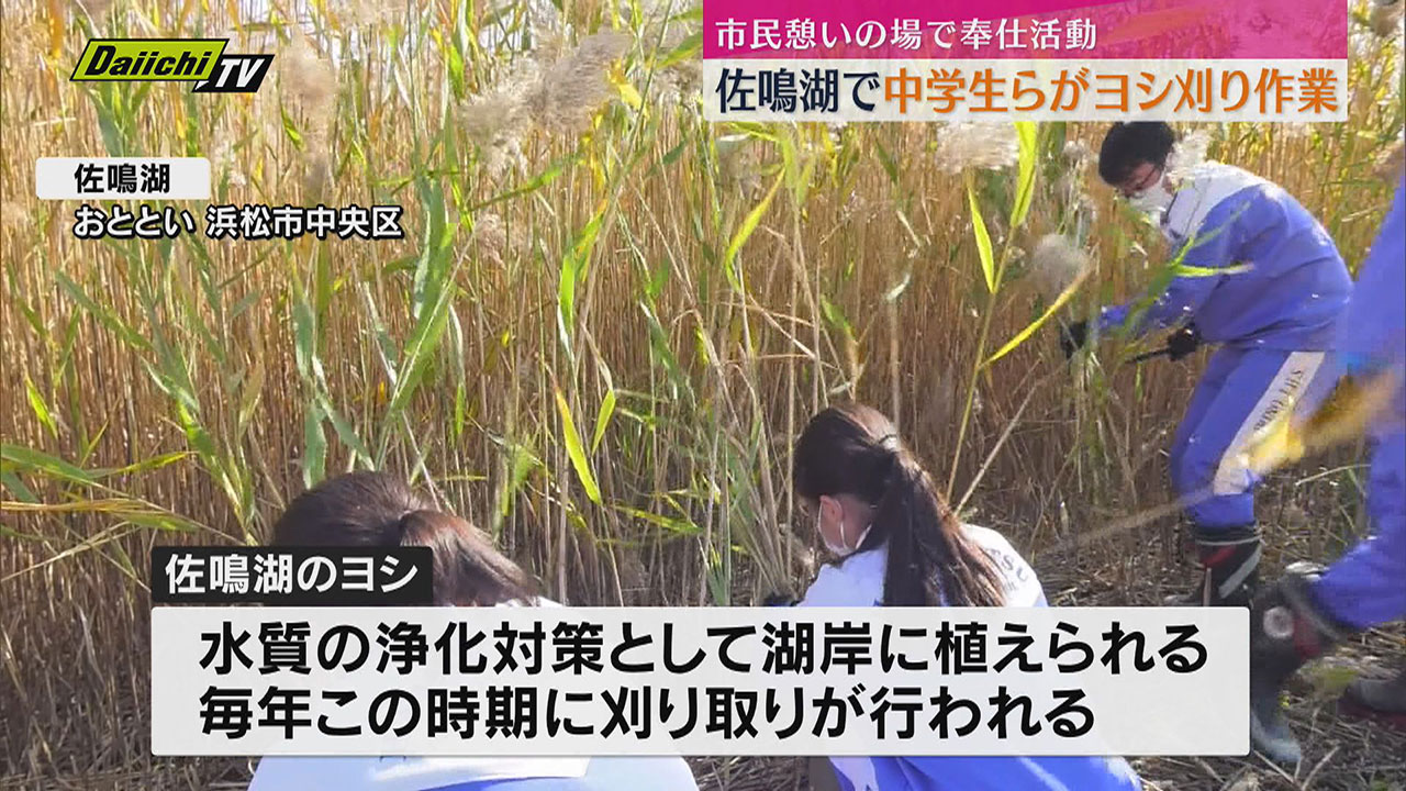 浜松市民の憩いの場として親しまれている佐鳴湖で15日、水質改善のために植えられた湖岸のヨシの刈り取り作業を中学生などが参加して行いました。
