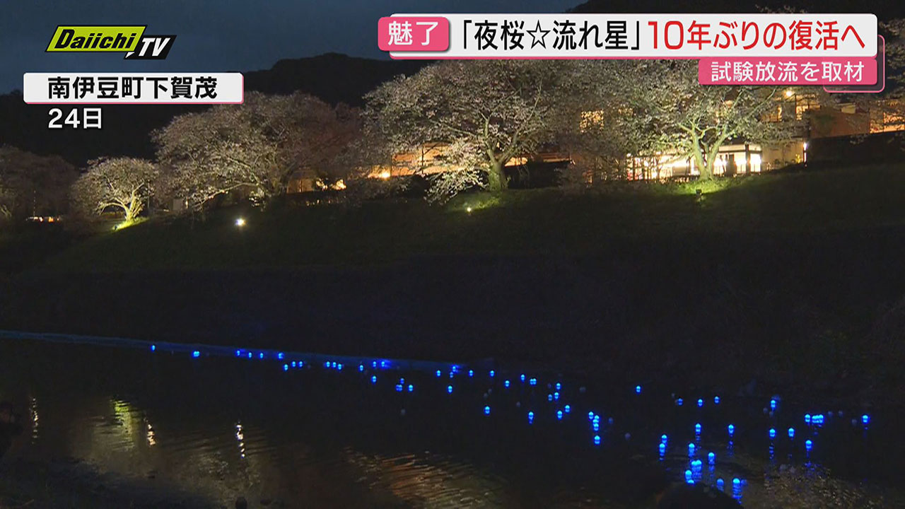 静岡・南伊豆町の町制施行70周年を記念して、あす2月27日から始まる特別企画「夜桜☆流れ星」。10年ぶりの開催に向け、先日、試験放流が行われ、川面に流れる青い光の玉が多くの人を魅了していました。