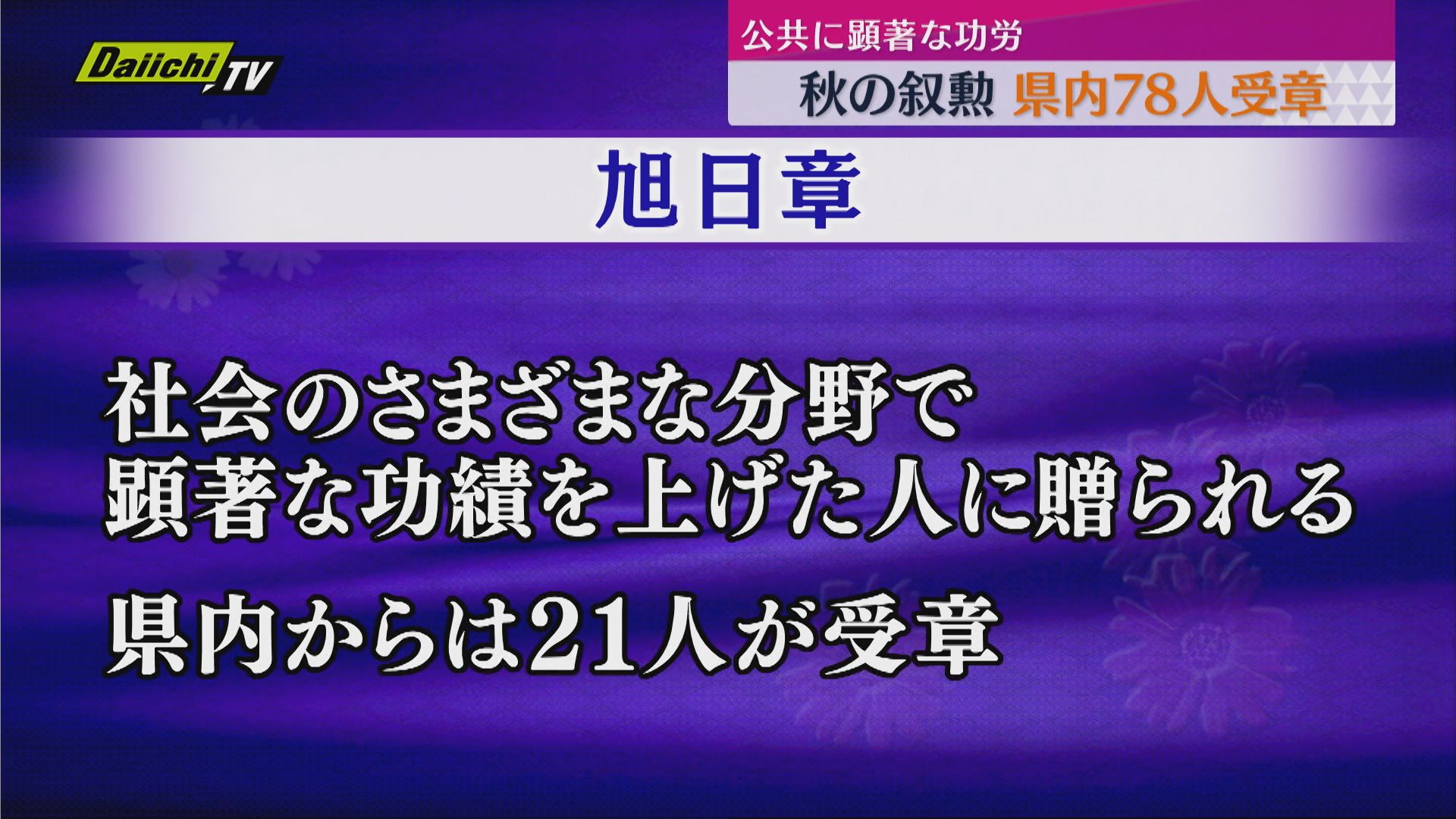 秋の叙勲の受章者が発表され、県内では旭日章、瑞宝章あわせて78人に授与されることになりました。