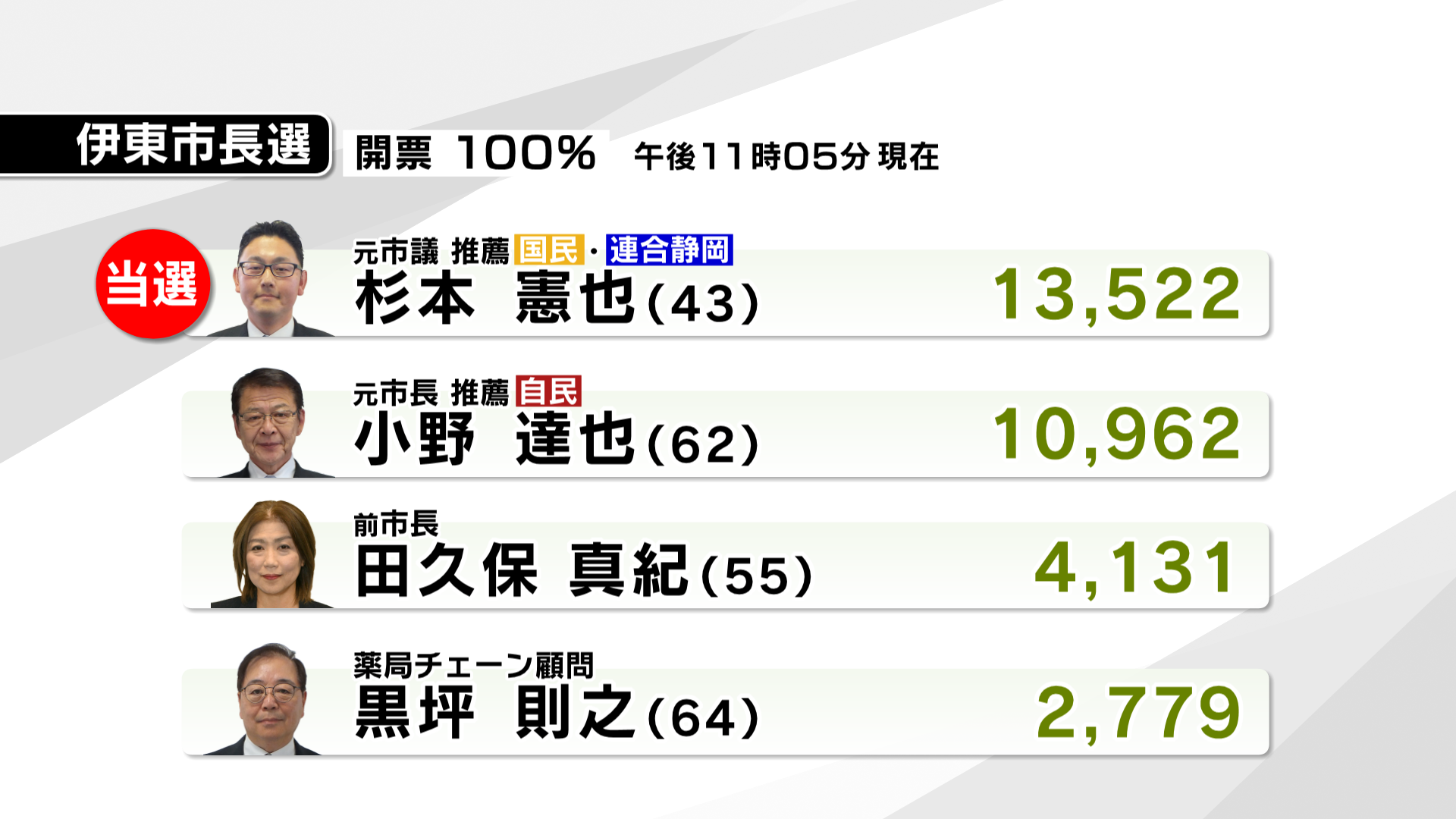 前市長の失職に伴う伊東市長選挙は元市議の杉本憲也さんが初当選しました。一方、再選を目指した田久保前市長は敗れました。