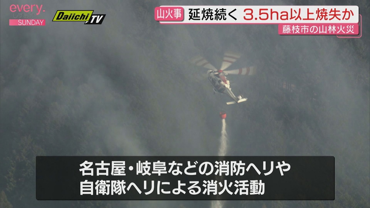 17日午後藤枝市瀬戸ノ谷の山林で火災が発生しました。火は藤枝市瀬戸ノ谷付近の山林を焼き、消防車12台と消防ヘリ2機が消火活動にあたりました。午後8時時点で、人や建物への被害は確認されていません。