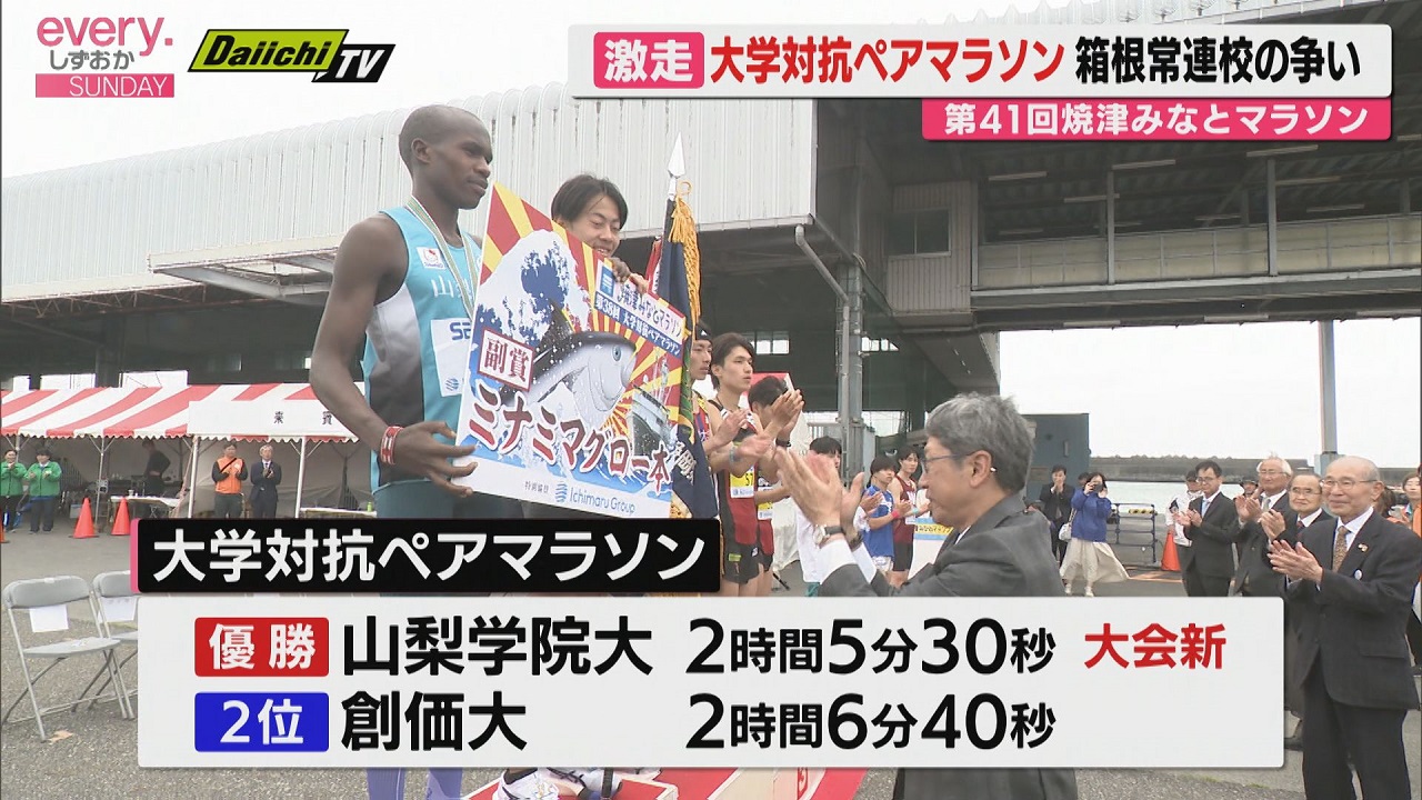 5日、焼津市で「第41回焼津みなとマラソン」が行われ、箱根駅伝常連校のランナーや多くの市民らが港町焼津を駆け巡りました。このうち、「大学対抗ペアマラソン」は山梨学院大学が大会新記録で優勝しました。