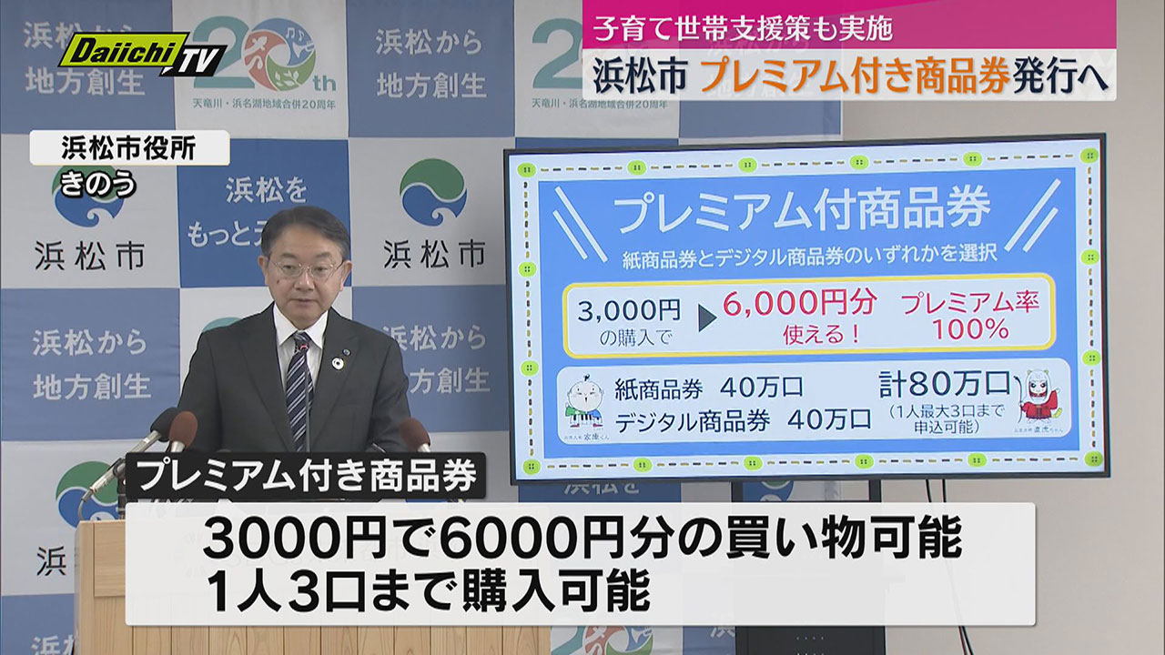 浜松市は国の交付金を活用した補正予算案を追加発表し、物価高騰対策として、プレミアム付商品券の発行や子育て世帯への応急手当を盛り込みました。