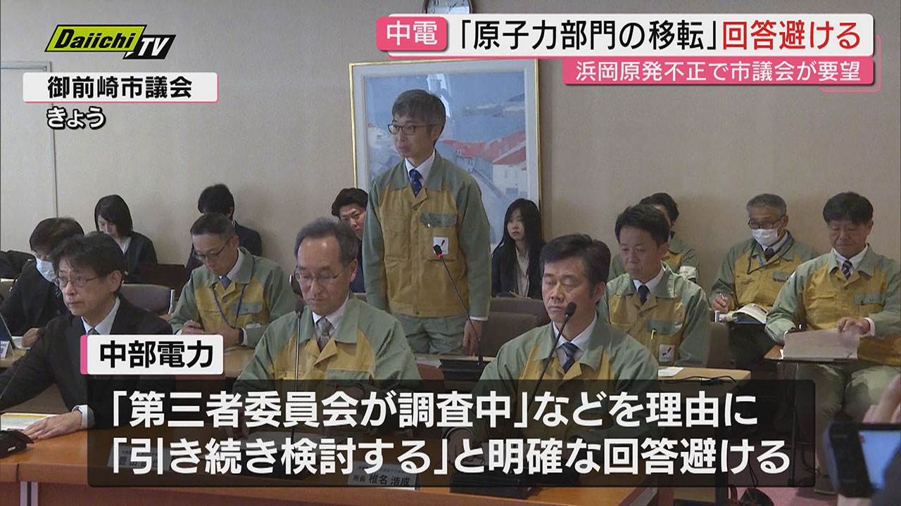 浜岡原発のデータ不正問題を受け御前崎市議会が中部電力の原子力部門を市内に全面移転するよう申し入れたことに対し中部電力は16日、調査中であることを理由に回答を避けました。