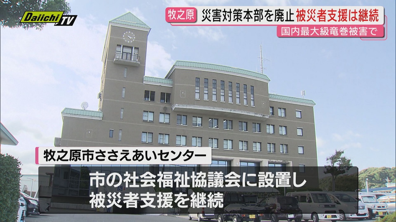 牧之原市は竜巻被害からの復旧支援が新たな段階に入ったとして、竜巻被害に関する災害対策本部をきのう廃止。市の社会福祉協議会に「ささえあいセンター」を設置し被災者支援を続けていく方針