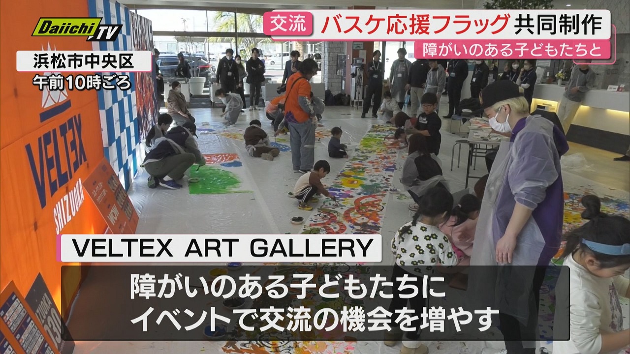 手形スタンプでカラフルに 浜松で障がい児と交流 ベルテックスの応援フラッグを共同制作(浜松市)
