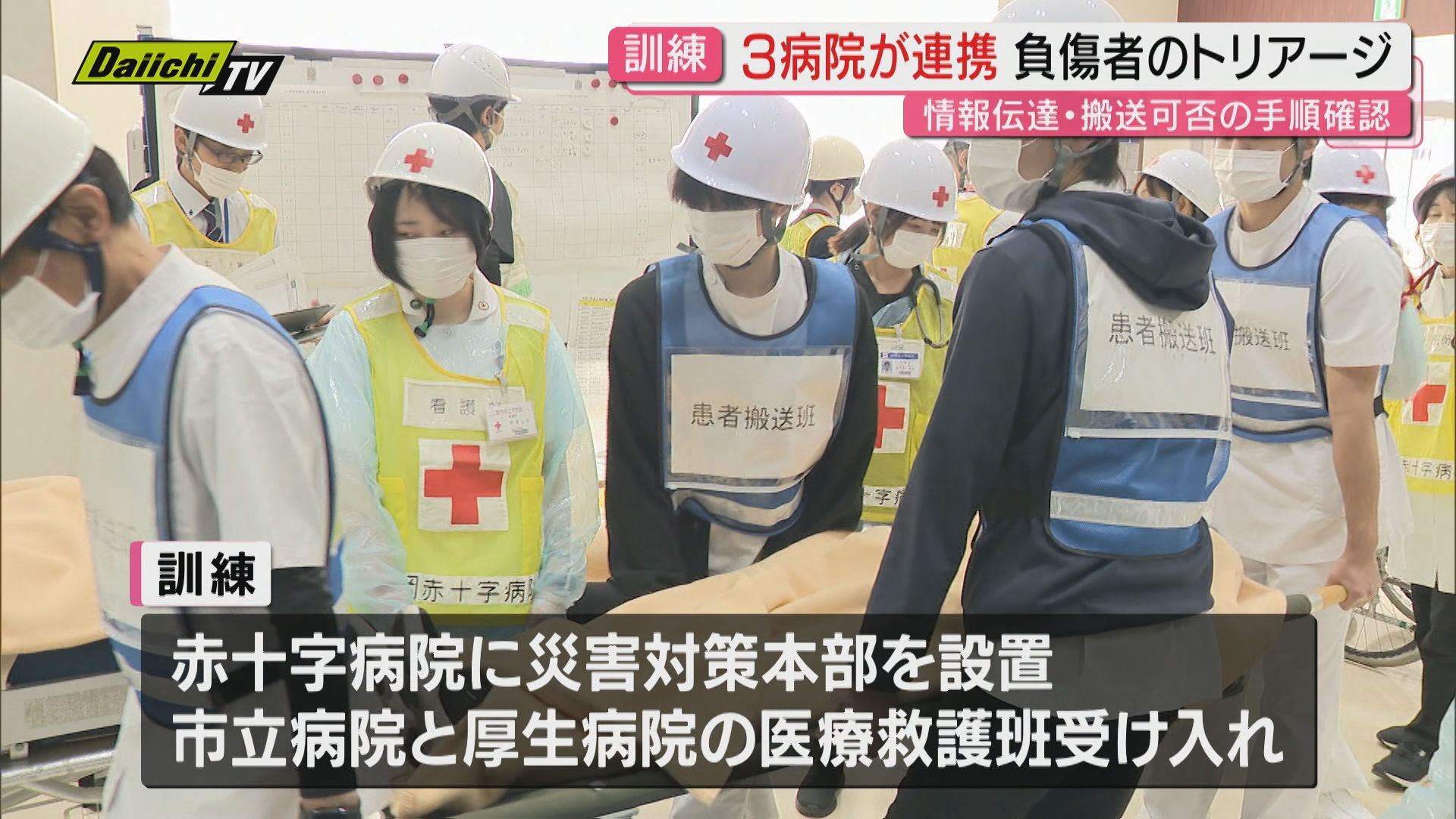 地域防災の日の7日、静岡市葵区の中心部にある3つの病院が連携した防災訓練が初めて行われました。これは、静岡赤十字病院と静岡市立静岡病院、静岡厚生病院が合同で行ったものです。