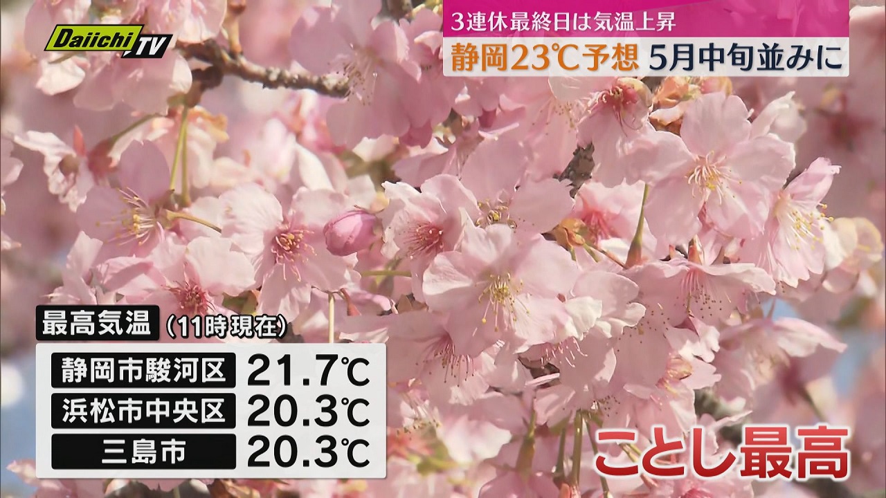 3連休最終日 静岡県内各地で20℃超の最高気温を観測 4月下旬から5月下旬並みの暖かさに(静岡)