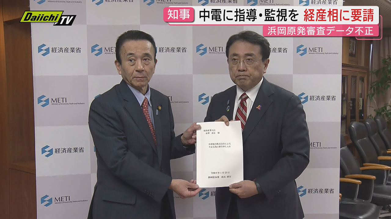 浜岡原発の再稼働に向けた審査を巡り、中部電力が不正にデータを操作した問題で、23日、静岡・鈴木知事が都内で赤沢経済産業相に対し、中電への指導や監視を求める申し入れを行いました。