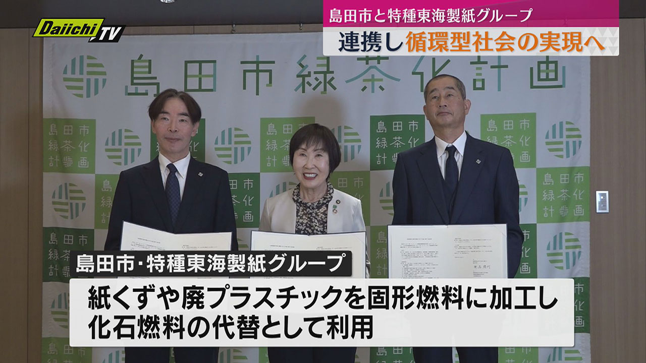 島田市は23日、脱炭素など地域課題の解決に向け特種東海製紙グループと連携協定を結びました。環境保全や脱炭素人口減少などの課題について、企業が持つ技術やノウハウを使って解決し、循環型社会の実現を目指します。