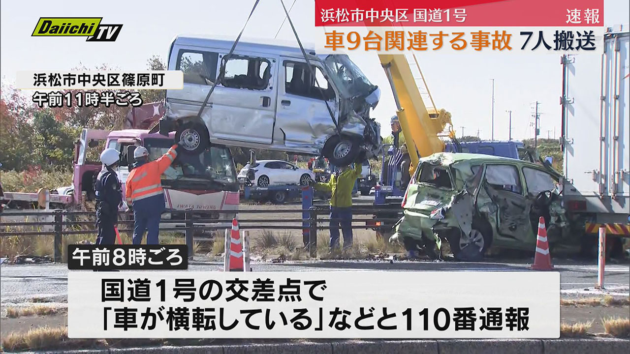 浜松市の国道1号で大型トラックと乗用車などあわせて9台が関連する事故がありました。この事故で7人が 病院に搬送されていますが、全員命に別条はないということです。