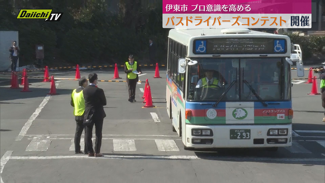 安全への配慮などでプロ意識を高めようと、県内のバス会社の運転手が運転技術を競うコンテストが15日伊東市で開催されました。