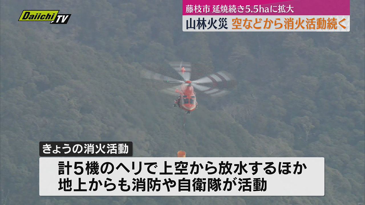 17日に静岡・藤枝市で発生した山林火災は延焼が続いていて、現在も消火活動が続いています。焼失面積は約5.5ヘクタールに拡大しました。これまでに人や建物への被害は確認されず、現在、煙は確認されていませんが鎮火には至っていないということです。
