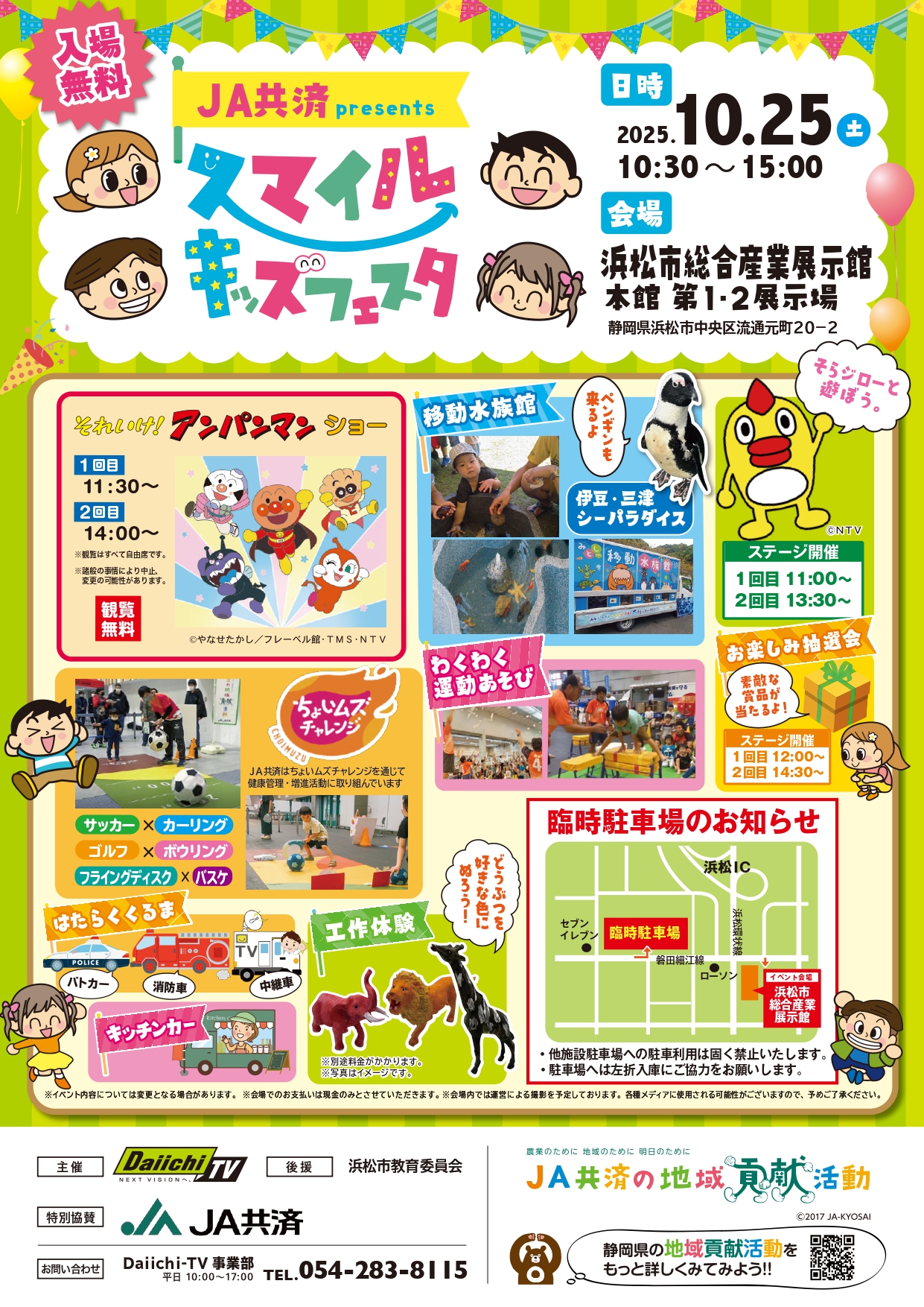 ブースはペンギンやふれあい可能な「移動水族館」や、動物のフィギュアへの色塗りや消しゴムブロックで色々な絵が作れる「工作体験」、スポーツを組み合わせたレクリエーション感覚で楽しめる「ちょいムズチャレンジ」、「パトカー」・「消防車」・「中継車」のフォトスポット、オリジナル免許つくり、地元スポーツクラブの「体操体験」、「地場野菜のマルシェ」など内容盛りだくさん。