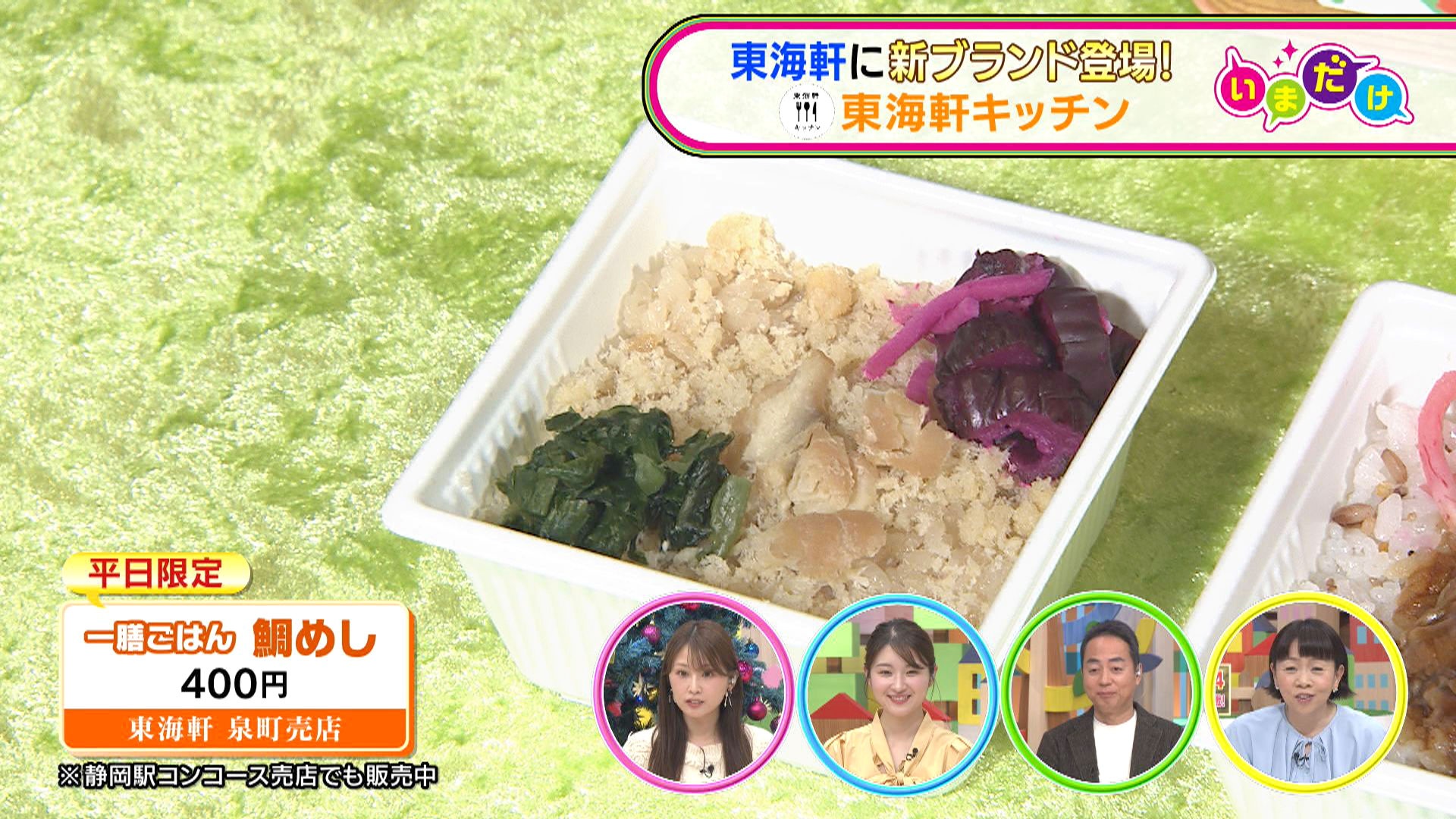 「いまだけ」バックナンバー いまだけ 2024年12月10日 (tue) 駅弁でお馴染み! 東海軒から新ブランド登場!! 【東海軒 泉町売店】 静岡市駿河区泉町1-8 ≪東海軒キッチン≫ ■一膳ごはん 鯛めし…400円(平日限定) ■一膳ごはん 牛カルビ…400円(平日限定) ■一膳ごはん 焼鯖…350円(平日限定) ■ちょこ菜シリーズ…250円~ ※静岡駅コンコース売店でも販売中