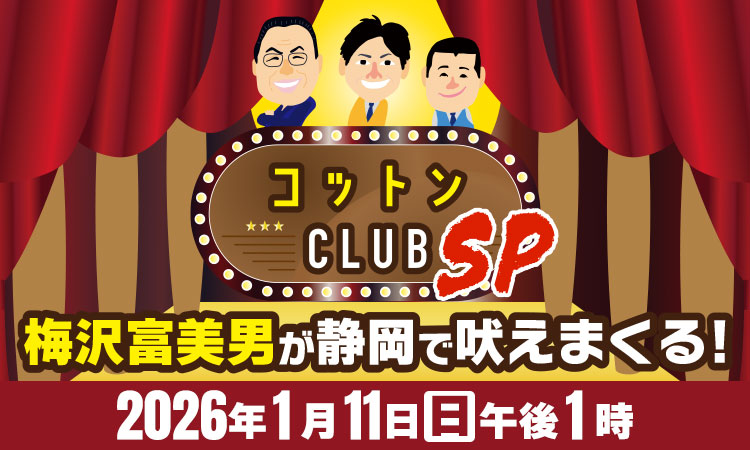 コットンCLUB SP ~梅沢富美男が静岡で吠えまくる~ 2025年12月26日 (fri) 静岡で長年愛され続ける名店を梅沢富美男とコットンが満喫! 創業330年! 15代将軍徳川慶喜が愛したの羊羹! 創業221年! 江戸時代から愛され続ける安倍川餅の名店! 創業272年! 八代にわたる独特な製法の元祖わさび漬け! 創業163年! 幻の養殖うなぎを使った極上のうな重! その他にも静岡人が愛し続ける名店、名品が続々登場!! 【出演】 梅沢富美男 コットン 【ナレーション】 落合福嗣