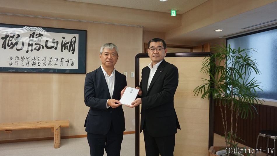 9月18日(水)Daiichi-TV本社で、株式会社ABC様から当社24時間テレビチャリティー委員会への募金贈呈式が行われました。ABC様の募金活動は今年で31回目を迎え、本社及び県内26店舗での募金活動総額は7,038,322円にもなり、同委員会に寄付して頂きました。当社24時間テレビチャリティー委員会委員長の赤座弘一会長よりABC冨田和宏社長に感謝状をお贈り致しました。