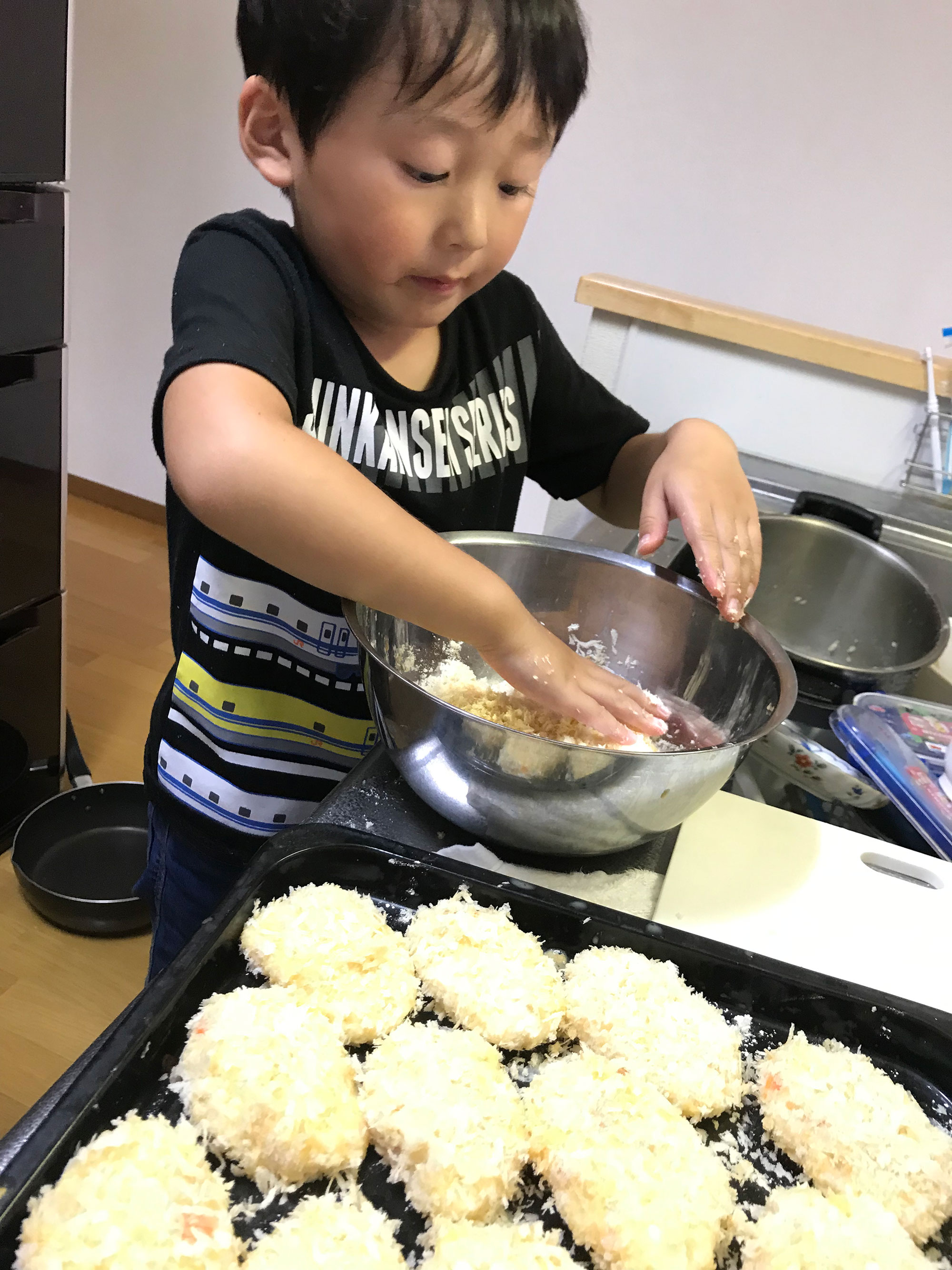 三島馬鈴薯を使って、長男とコロッケ作り!外はサクサク、中はとろーり美味しいポテトコロッケの完成!コロッケを揚げてる間は、弟がフライパンの近くに行かないよう一緒に遊んでもくれました。頼りになるお兄ちゃんありがとう。最近はお手伝いをたくさんしてくれるので、これからも一緒に美味しいご飯を作りたいと思います。