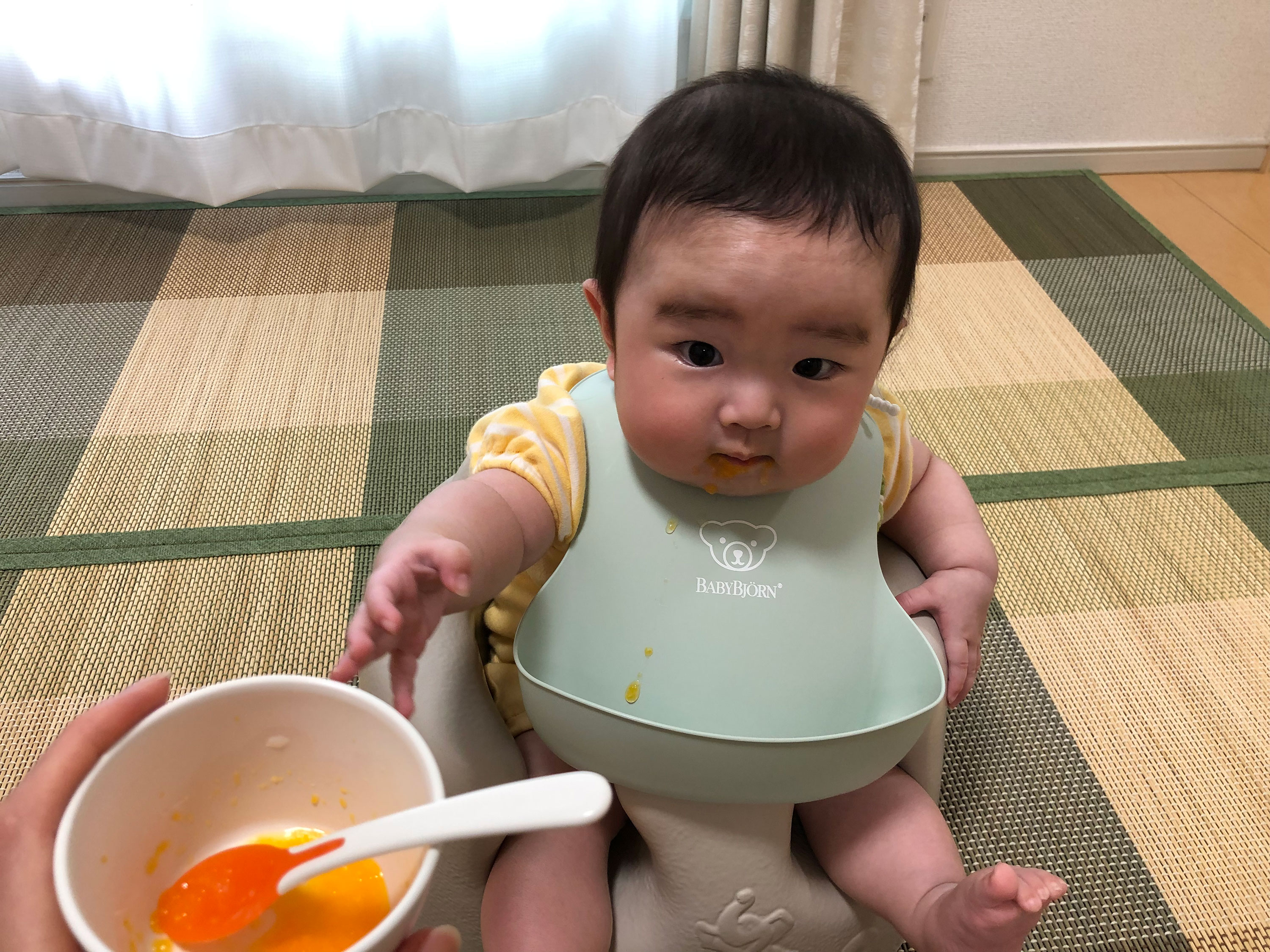 食事に慣れてきて、離乳食を見せると『早くちょうだい!!』と催促するように手を伸ばすようになりました。