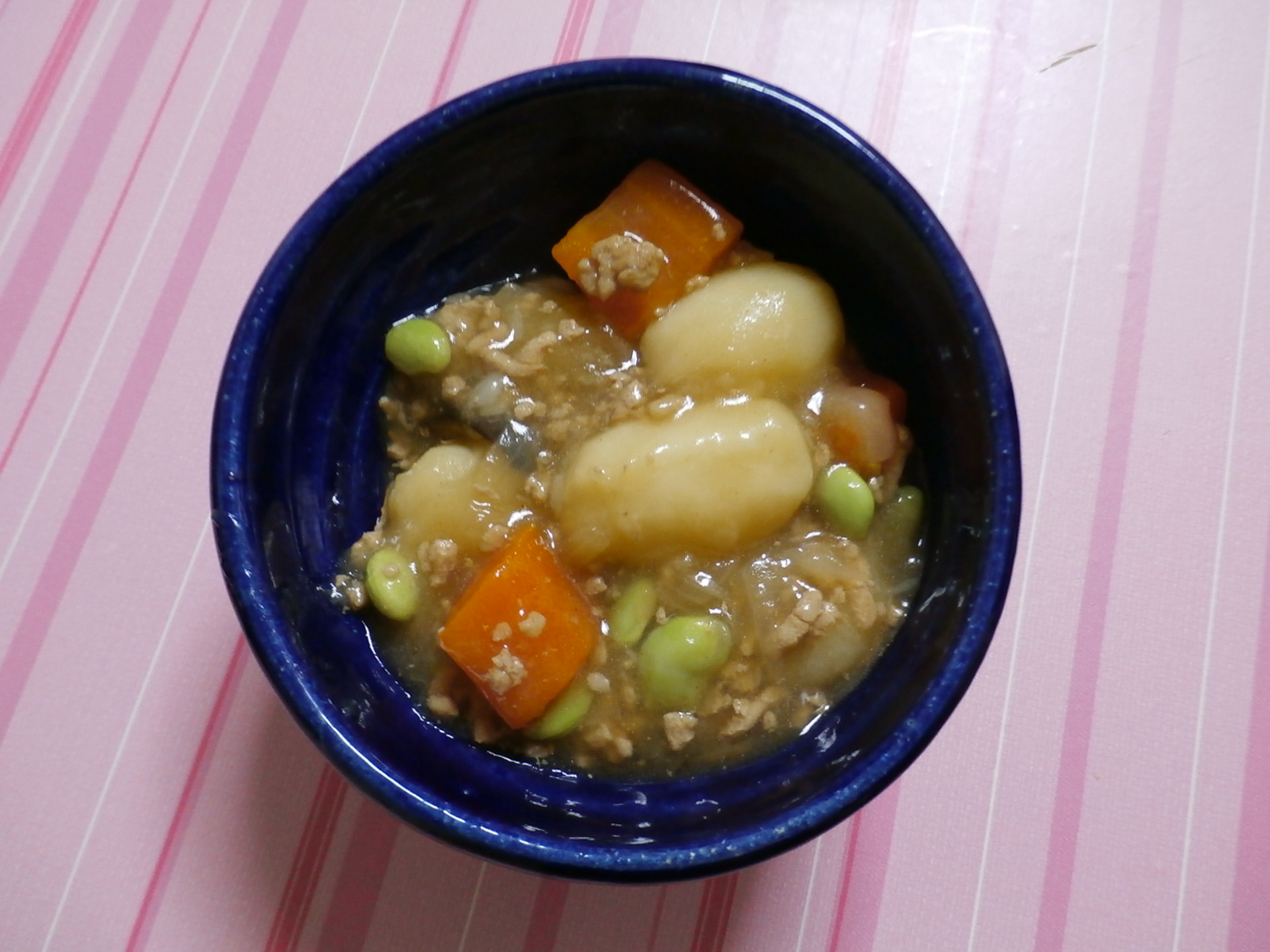 味付けは普通の「肉じゃが」とほぼ同じですが、お肉は挽肉でお汁はあんかけ風なんです。