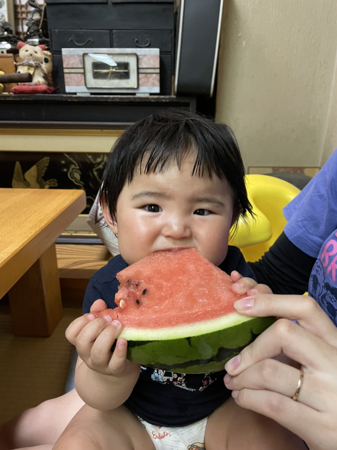 初物、函南スイカです。生後8ヶ月の孫、ひなたちゃんの大好物です。