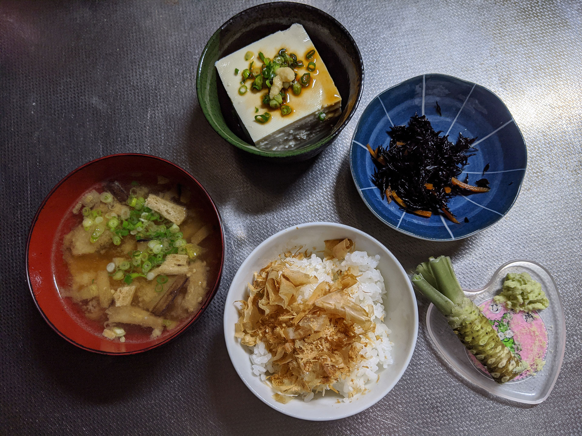 ナスのお味噌汁、冷奴にひじき煮、和食最高!